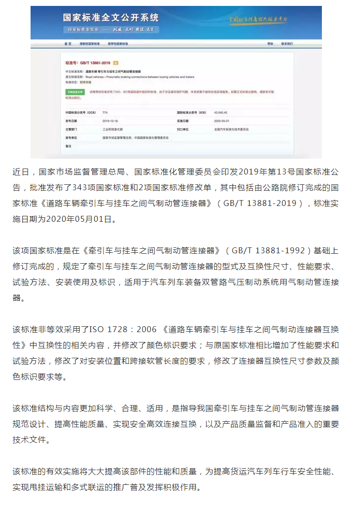 國家標(biāo)準(zhǔn)《道路車輛牽引車與掛車之間氣制動管連接器》發(fā)布